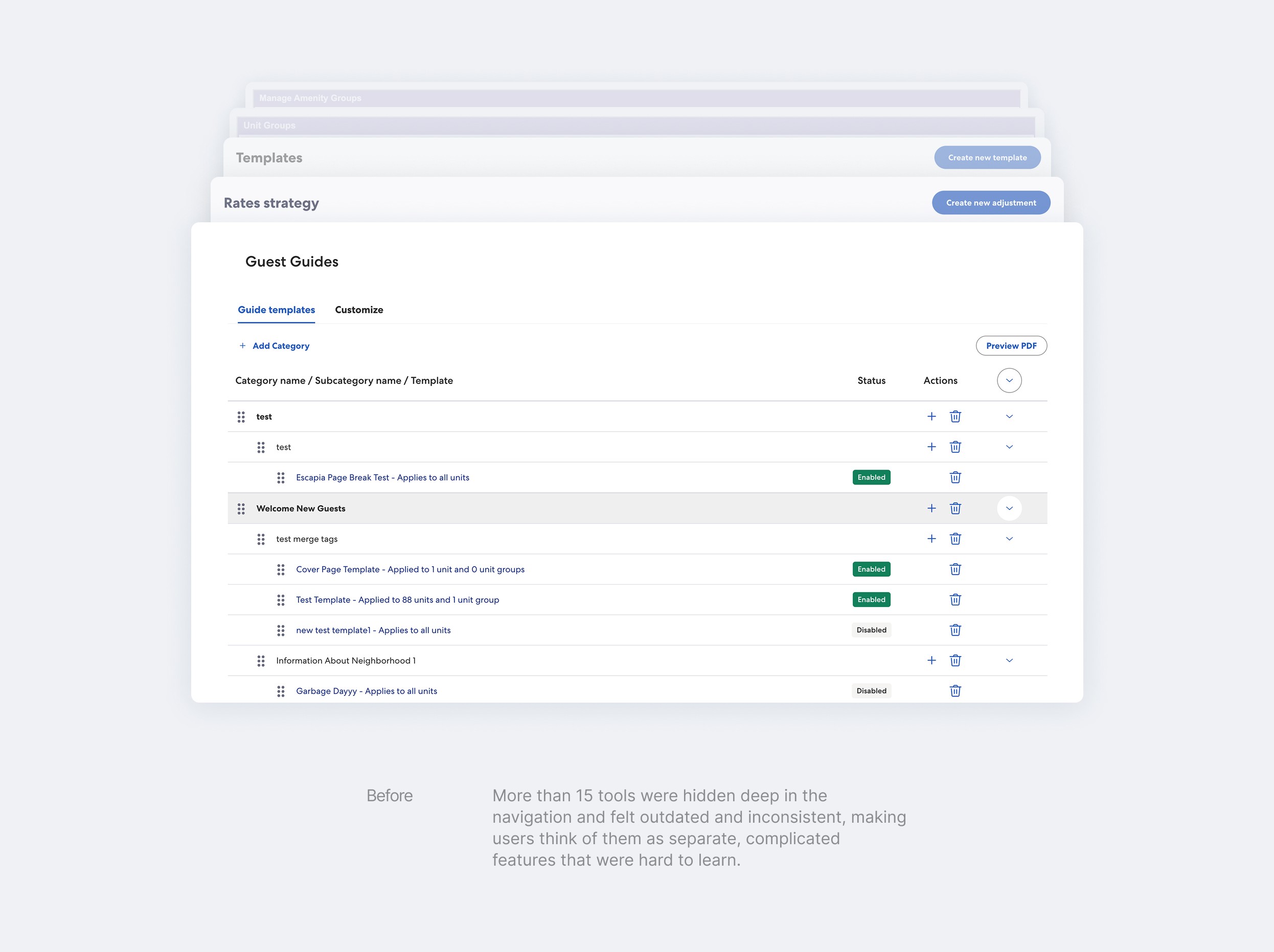 While reviewing promotions, I found Escapia’s pricing tools were fragmented and unclear. I developed a unified taxonomy with clear categories, which guided the promo flow and became central to Escapia’s navigation redesign.