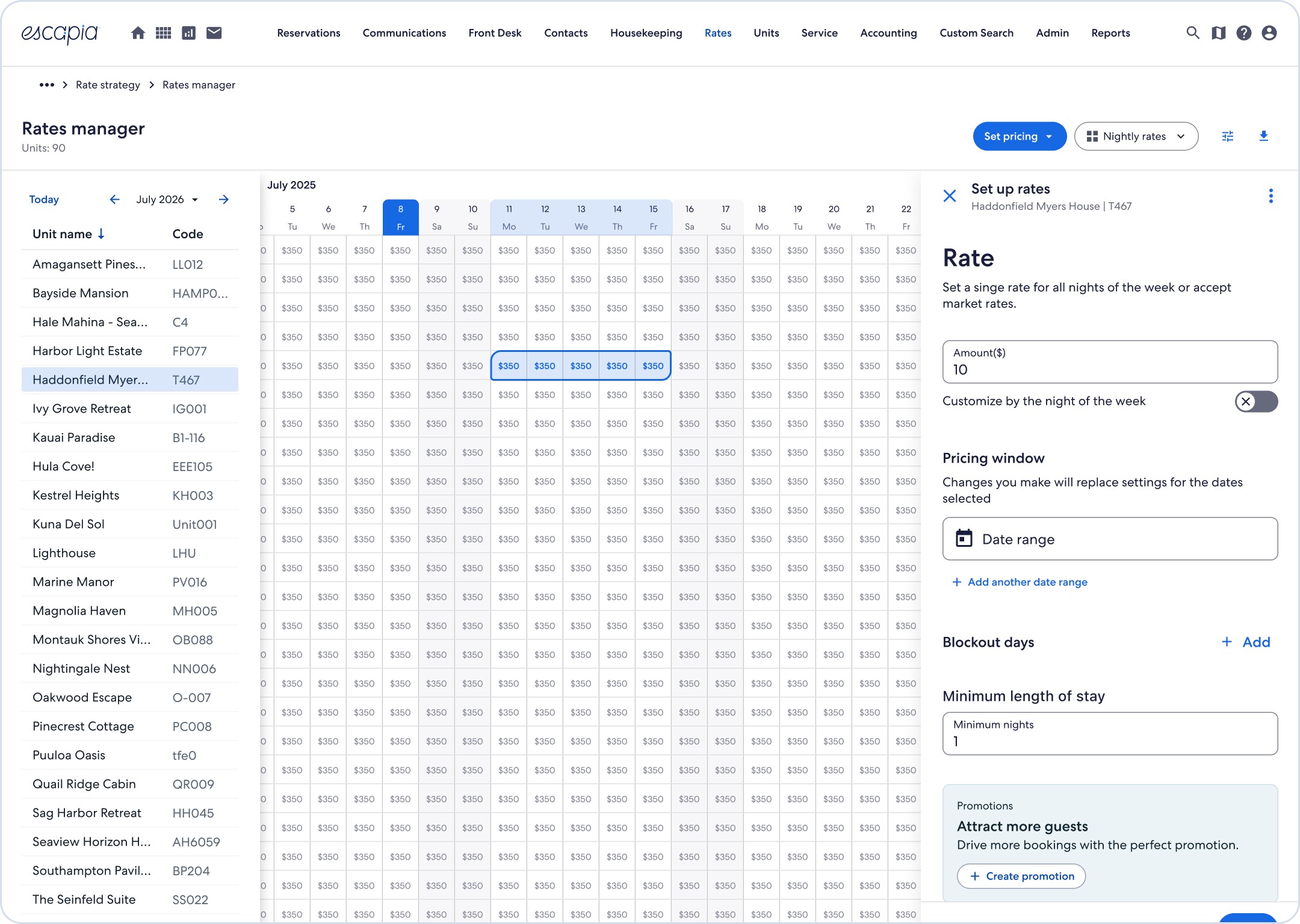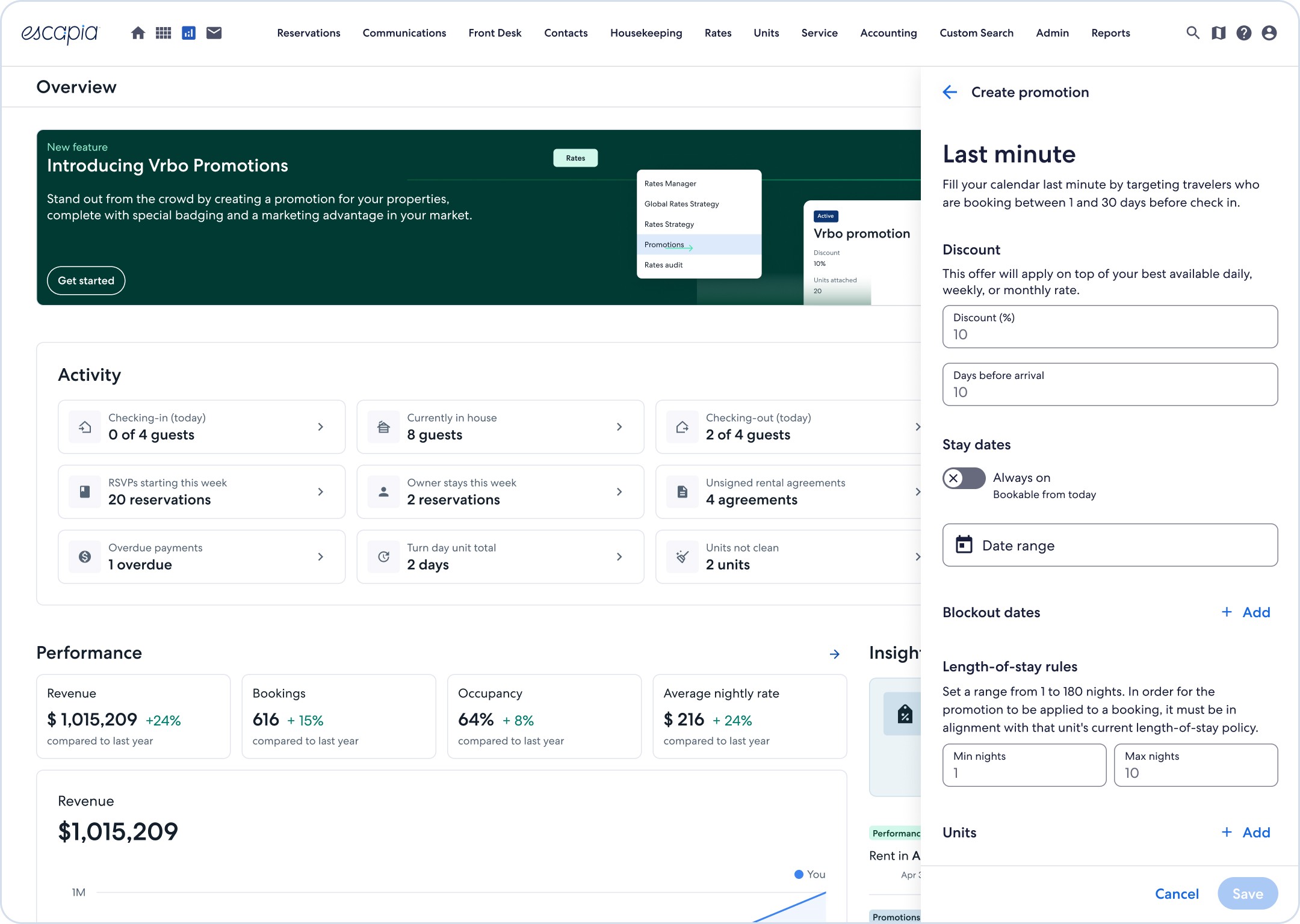 This release let property managers create and sync promotions directly in Escapia, while laying the groundwork for future cross-channel automation with platforms like Airbnb and Booking.com.