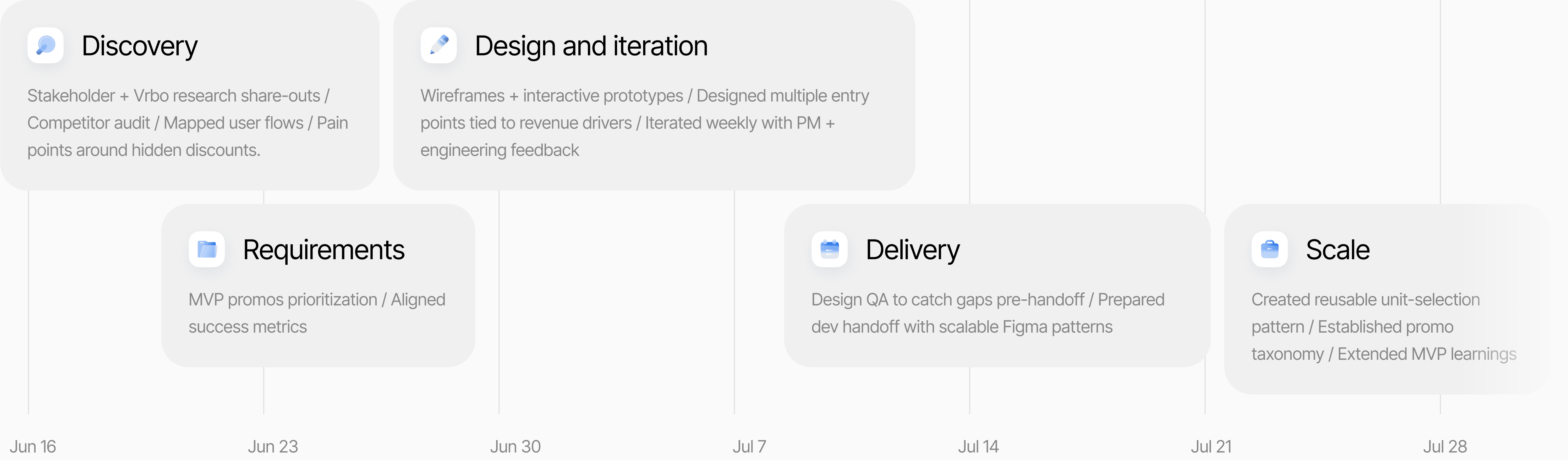 I worked closely with PMs, developers, and Vrbo partners to drive project success. I promoted design QA practices to identify UX gaps before development handoff, which reduced rework and shortened cycle times.